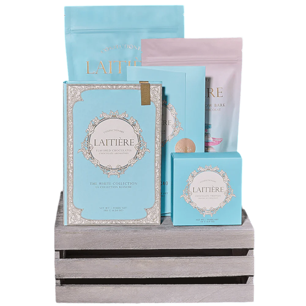 Satisfy your sweet tooth with the Absolute Chocolate Smorgasbord Gift Basket from Boston Baskets. Indulge in a decadent array of chocolates including rainbow chocolate bark, dark chocolate bars, white chocolate caramel popcorn, a dark chocolate bar, chocolate truffles, and a wooden gift crate.