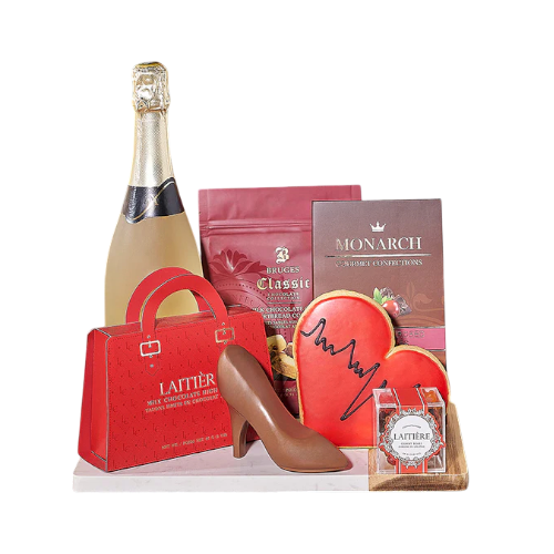 The Bubbly & Sweet Valentine's Gift Basket makes an exquisite gift. Indulge in a bottle of sparkling wine, milk chocolate chip shortbread cookies, chocolate covered cranberries, milk chocolate high heels, a handmade red heart-shaped cookie, gummy bears, and a wood & marble serving board.