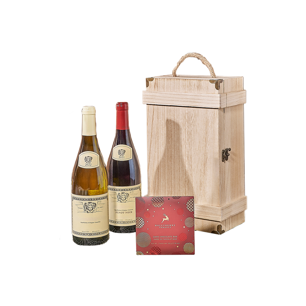 Delight the wine enthusiast on your holiday list with the Christmas Wine Duo gift set from Boston Baskets. Featuring two bottles of wine, a bar of dark chocolate bar, and a wooden gift box, it's a perfect blend of elegance and indulgence.