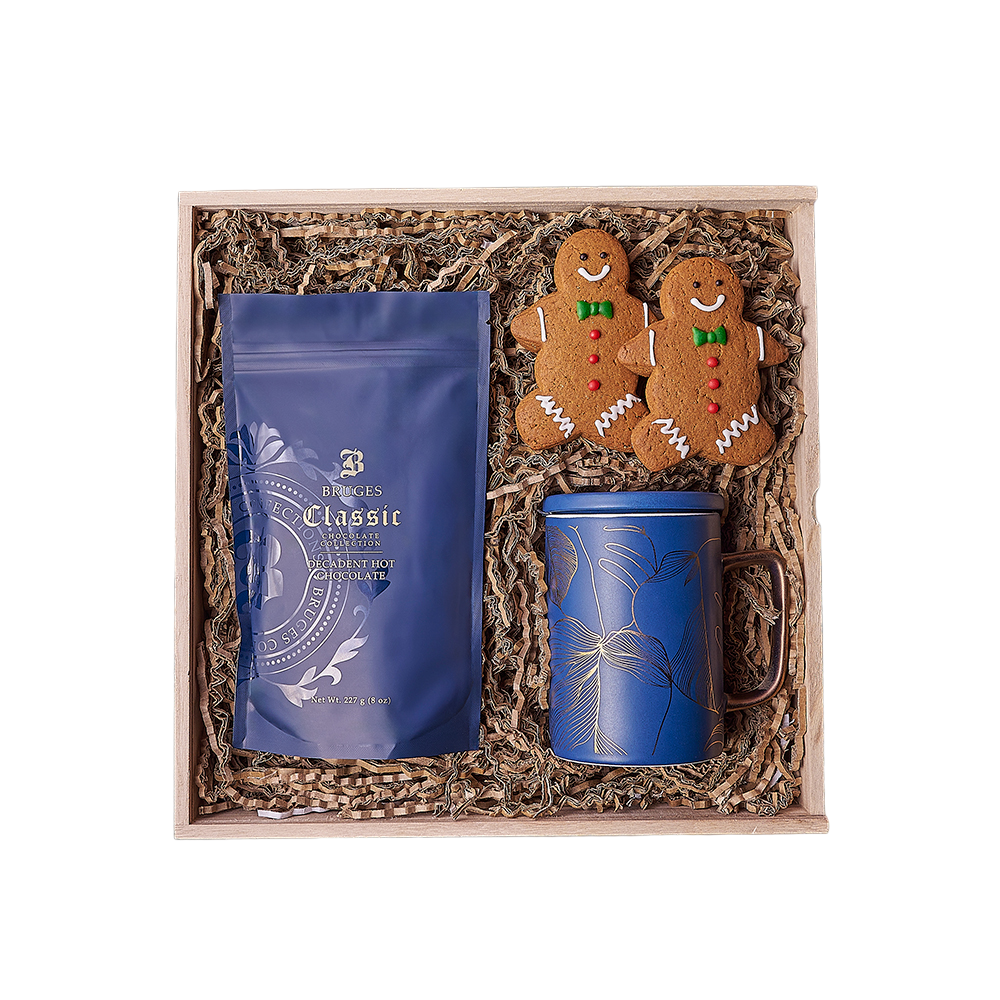 Indulge in the ultimate chocolate lover's dream with our Holiday Hot Chocolate & Treats Basket! Packed with gourmet delights like smooth hot chocolate mix, handmade gingerbread cookies, and a beautiful blue & gold mug, it's the perfect gift for anyone with a sweet tooth.