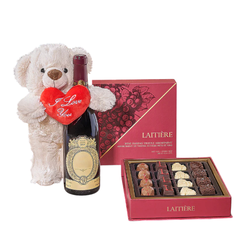 The Richview Valentine’s Day Wine Basket elevates this Valentine's Day to a memorable moment. This iconic Valentine’s Day gift includes a bottle of wine, a charming bear holding a heart, and a box of wine-inspired chocolate truffles.
