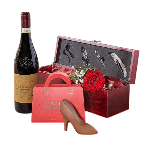 With the Rose and Wine Gift Box from Boston Baskets, indulge in a gift worth sharing. This charming gift features a bottle of wine, a beautiful red rose, milk chocolate high heels, and a lovely wine serving box that includes wine serving and storage tools in the lid.
