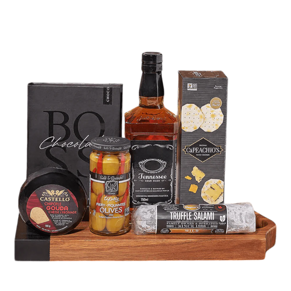 Elevate your next gathering or surprise someone special with the Salami, Cheese & Liquor Board from Boston Baskets. This opulent gift is filled with decadent gourmet delights fit for royalty. Indulge in a bottle of liquor, crackers, chipotle gouda cheese, truffle salami, tipsy fiery olives, a box of chocolate bars, and a lovely wooden serving board.