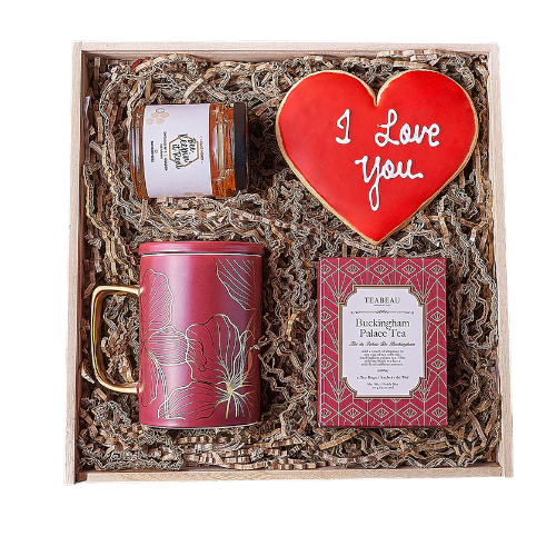 Indulge in the St. Lawrence Valentine’s Day Box from Boston Baskets. This fantastic gift basket is thoughtfully curated with a handmade ‘I Love You’ heart cookie, a jar of honey, Buckingham Palace tea, a red & gold mug, and a wooden gift box. Make their Valentine’s Day truly memorable with this wonderful gift basket from Boston Baskets.